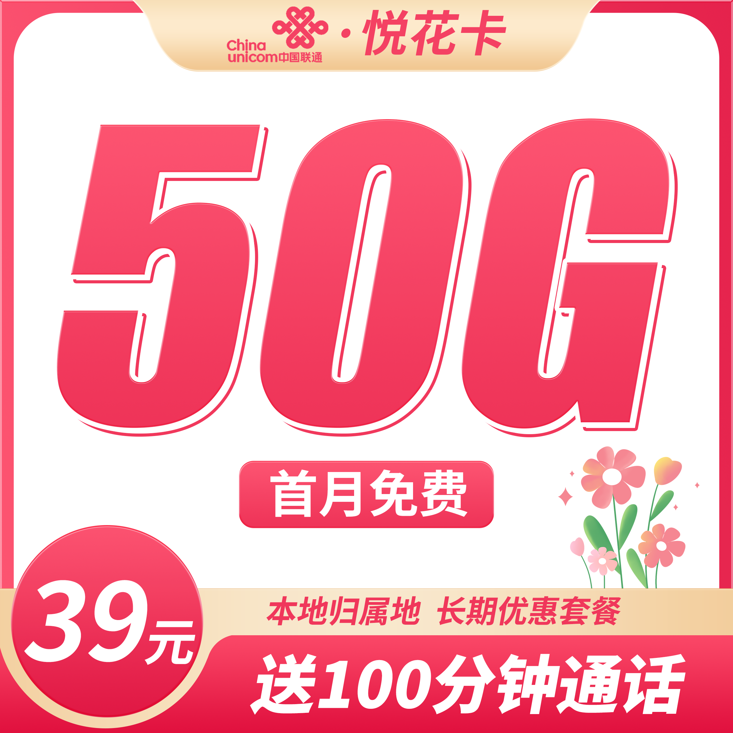 - 首月免月租,第2-12个月39元/月,每月可享50G大流量(20G通用+30G定向)