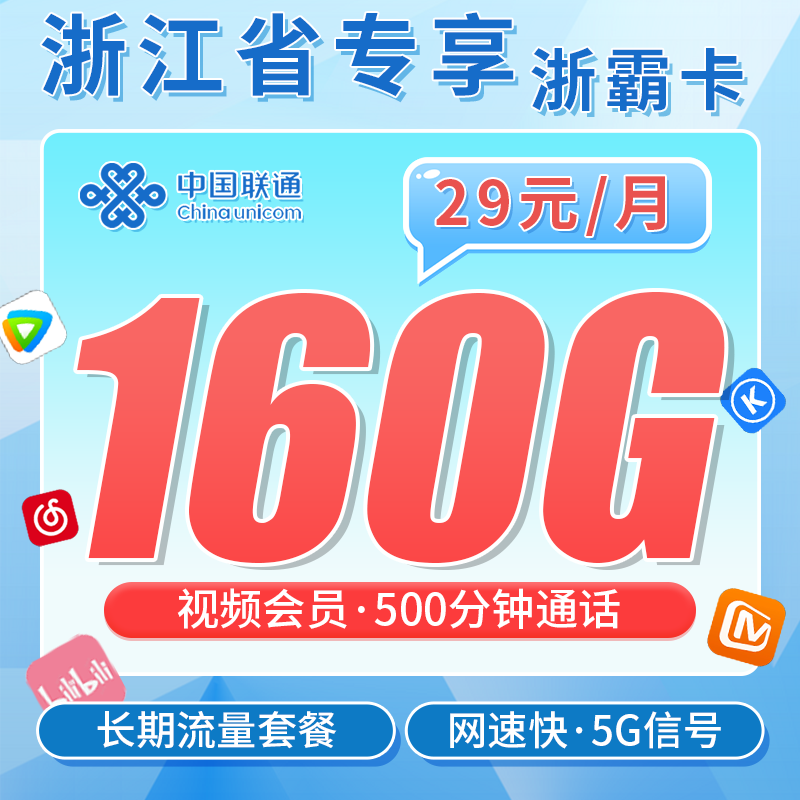 联通浙霸卡29元160G+500分钟+送视频会员+浙江专属!