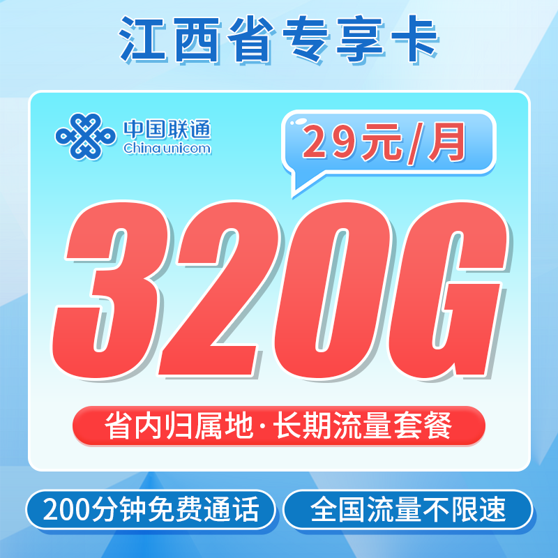联通江西卡29元320G+200分钟+江西专属套餐构成首月为49元320G+200分钟按天折算到账;次月开始,29元320G+200分钟,长期有效归属地江西不发地区只发江西配送方式联通人员上门办理激活方式上门激活首充渠道激活后72小时内联通APP内一次性首充100元办理年龄18-59岁违停复机根据短信操作套餐合约6个月合约注销方式支持异地注销、营业厅注销,合约期内注销有违约金,违约金=(原套餐月租-当前月租)×已履约月份,如有变动以官方为准
