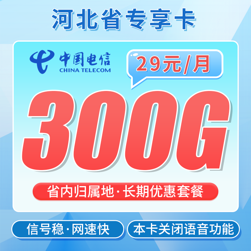 电信河北卡29元300G省内流量+河北专属!套餐构成首月29元按天折算,之后每月29元;首月流量为300G按天折算;次月开始每月300G流量;长期有效;关闭语音功能!归属地河北不发地区该卡仅发河北配送方式京东/顺丰激活方式自主激活首充渠道激活过程中强充值100元办理年龄18-60岁违停复机-套餐合约无合约注销方式支持异地注销、当地营业厅注销、中国电信APP线上注销