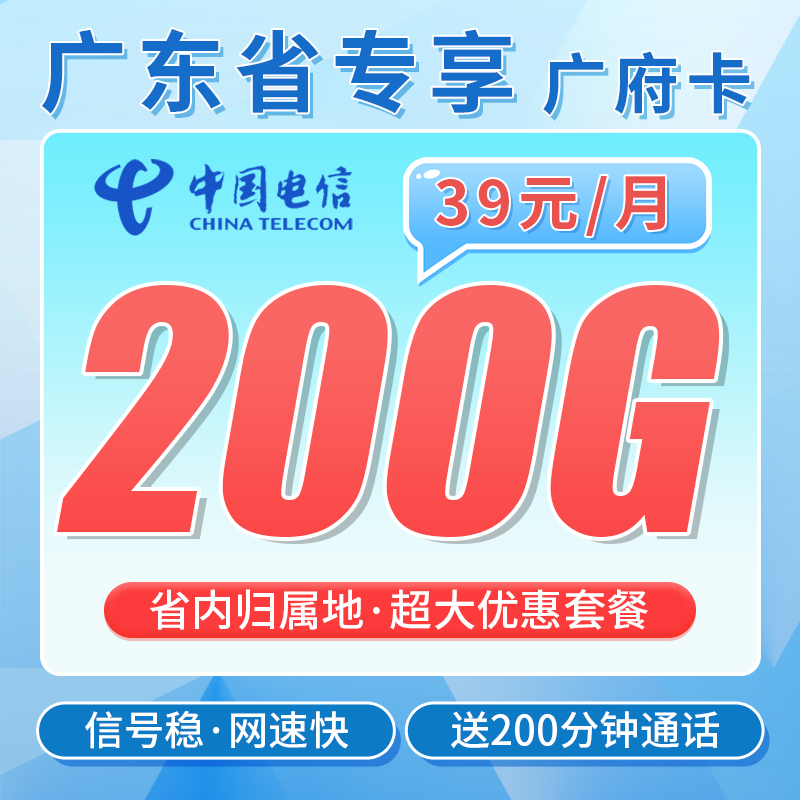 电信广府卡39元200G+200分钟通话+广东省专属!