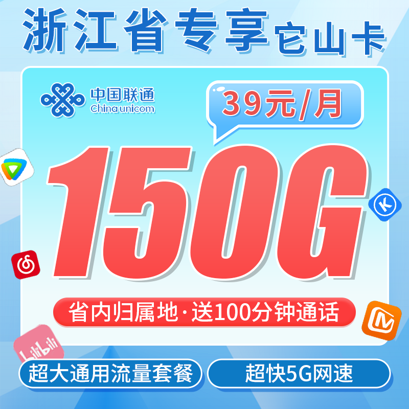 联通它山卡39元150G+100分钟+浙江专属!